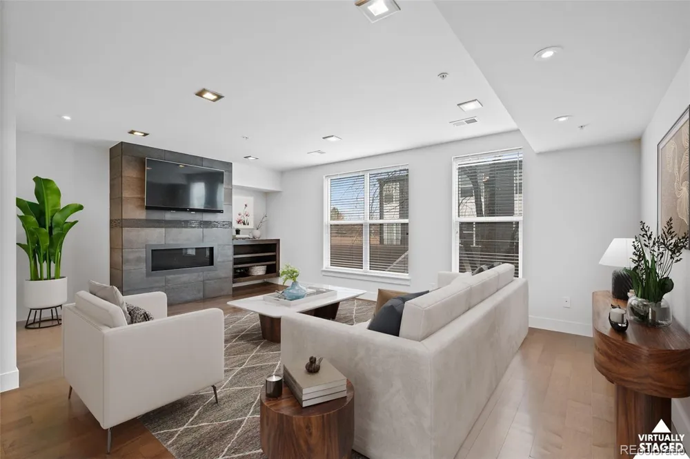 Located in the Sloan’s Lake neighborhood of Denver, this modern 2-bedroom, 2.5-bathroom townhome offers a bright open floor plan, contemporary finishes, and a private attached garage. The main level features a spacious kitchen with quartz countertops, a large island, stainless steel appliances, and a clean backsplash design. An electric fireplace and oversized windows add warmth and natural light throughout the living area. Upstairs, two bedrooms and two bathrooms provide well-designed separation of space, including a light-filled primary suite with contemporary finishes. The entry level includes built-ins and storage for jackets, gear, and everything that comes with Denver’s four-season lifestyle. Wood, tile, and carpet flooring add texture and function throughout the home. A private rooftop deck offers panoramic views of the city skyline and the mountains, creating an ideal space for hosting, relaxing, or watching game-day fireworks from nearby Empower Field. The attached private garage adds everyday convenience, and the quiet residential setting provides a short commute to downtown. With no HOA, easy access to Sloan’s Lake Park, and proximity to local favorites like Snarfburger, Santiago’s, 2194 Coffee, and Little Machine Beer, this home combines modern comfort with one of Denver’s most walkable and connected neighborhoods.