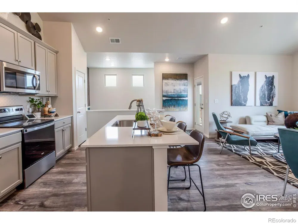Welcome to modern living in the heart of Raindance Windsor! Find instant equity with this 2-bedroom, 2-bathroom condo, built in 2021, offering contemporary living at its finest. Boasting an open floor plan with luxury vinyl plank flooring throughout, the spacious living area is flooded with natural light, creating a warm and inviting atmosphere. The sleek kitchen features stainless steel appliances, white quartz countertops, and ample storage, perfect for both everyday meals and entertaining guests. The large primary suite is a retreat, complete with an en-suite bathroom and generous closet space and a double vanity. Enjoy the convenience of an insulated one-car garage, along with access to exclusive community amenities, including a pool, fitness center, and walking trails. Located in the desirable Raindance Windsor neighborhood, you'll have easy access to shopping, dining, and recreational activities. Don't miss the opportunity to make this condo your next home! Schedule a showing today.