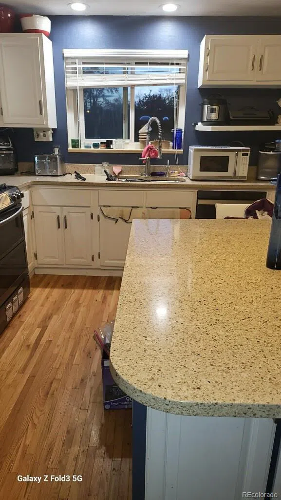 Great opportunity to own a brick ranch home with 4 bedrooms and 2 baths on a corner lot in Arvada! With some paint and a little work you can make this your dream home and benefit from the sweat equity! The kitchen features a large island, plenty of white cabinets with pantry, quartz countertops, and newer appliances (2019) including a SMART Dishwasher. Hardwood flooring runs throughout the kitchen, living/dining room and the oversized primary bedroom and secondary bedroom on the main level. The baths have been updated to include new vanity, shower heads, faucets and toilets. There is also a family room with gas fireplace that finishes the main level and provides access to the patio and private, fenced backyard. The basement has luxury vinyl plank flooring and features a large family room, two additional bedrooms, 3/4 bathroom, separate storage area and a large laundry room. The home has many upgrades and improvements including both central air and evaporative cooler (2021), upgraded electrical with recessed lighting and additional outlets in many rooms, Instant hot water at Kitchen sink, radon mitigation system, sewer liner installed (2019), new garage door opener (2018), garage heater, sprinkler system and controller with ability to add drip irrigation in backyard (2021). Please see the Amenities and Improvements Sheet in Supplements for all of the details. Seller is also offering a 5-year Roof Certificate. There is additional RV parking on the side. Property is being sold AS-IS. Great location within walking distance to retail and restaurants and is an easy drive to Denver, Boulder and to the mountains!