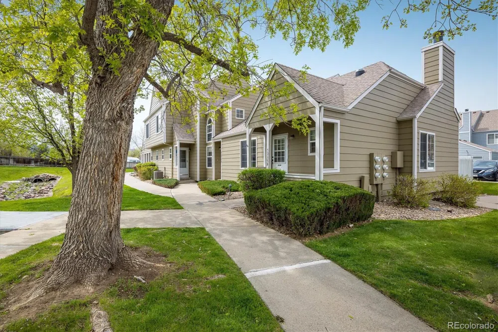 End-unit in sought after West Arvada. This darling two bedroom condo feels more like a townhouse. Welcome home to a covered front porch shaded by mature trees overlooking a grassy area with a sweet trickling stream. The open concept floor plan with a cozy fireplace lives well all on ground level. Nobody above or below. Included is a detached one-car garage opening to your own spacious fenced in patio, perfect for bar-b-ques and outdoor dining. Steps away is a lovely foot path along the stream to Moon Gulch Park. Apex Rec Center is just a few blocks to the East. Showings begin Friday, May 17.